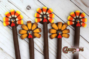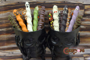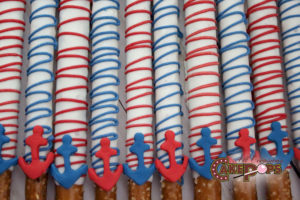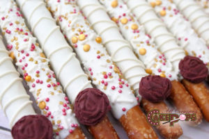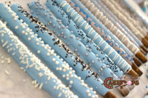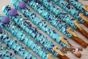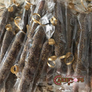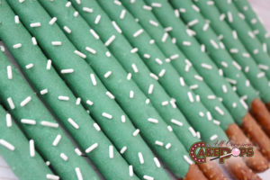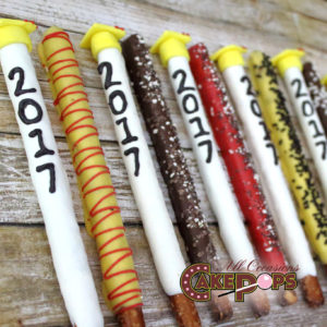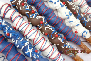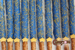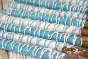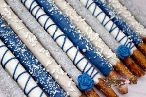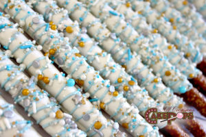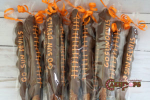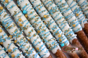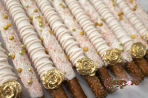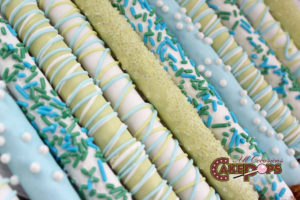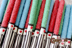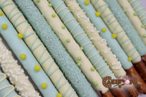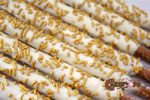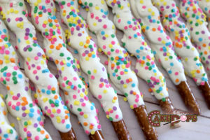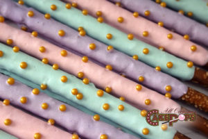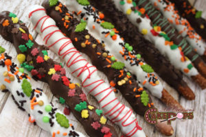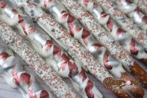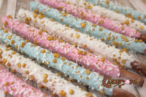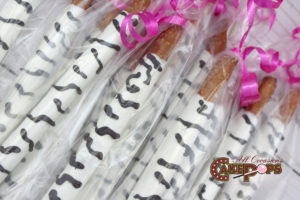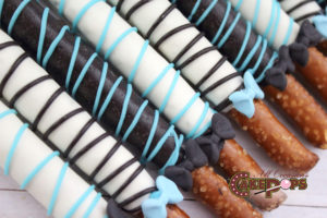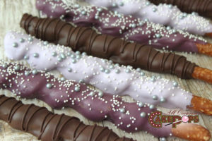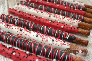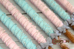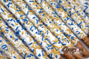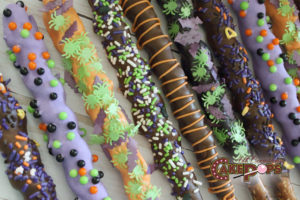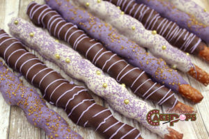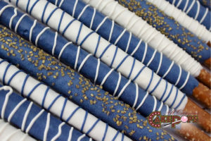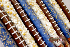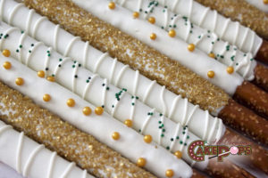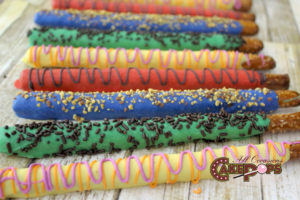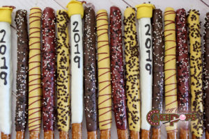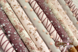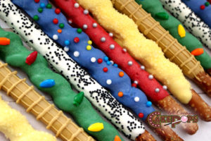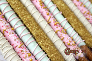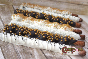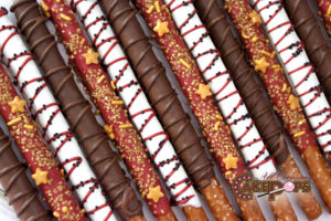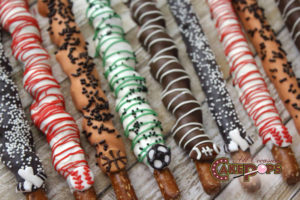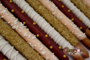 Chocolate dipped & caramel swirled DESIGNED pretzel rods – $3.00 each